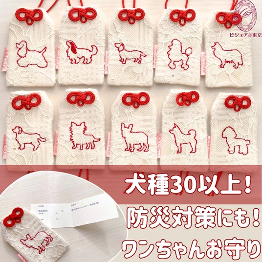 (3)ワンニャングッズ防災アイテムにもなる「ワンちゃんお守り」は、キュートなワンちゃんのシルエットが刺繍されたお守り袋。選べる犬種は現在30種類まで増加。今後も新商品の発表が控えておりますので、SNSなどフォローしてお待ちください。