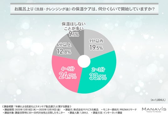 「お風呂上り(洗顔・クレンジング後)の保湿ケアは、何分くらいで開始しているか」について尋ねたところ、『