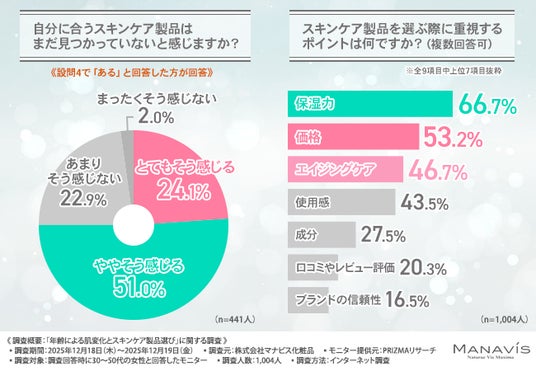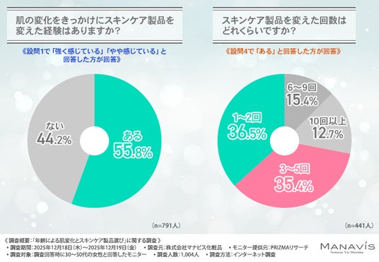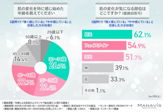 株式会社マナビス化粧品(所在地:千葉県浦安市、代表取締役社長:兼子 慎一)は、30~50代の女性を対象に、「年齢による肌変化とスキンケア製品選び」に関する調査を実施しました。