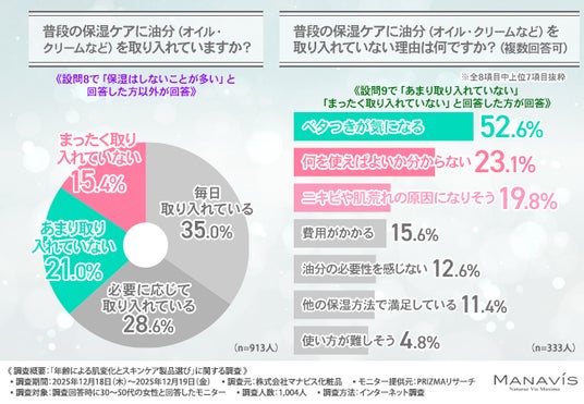 また、『何を使えばよいか分からない』「肌トラブルにつながりそう」といった回答も見られることから、油分ケアに対する理解や情報の不足が、選択をためらう背景にある可能性が考えられます。