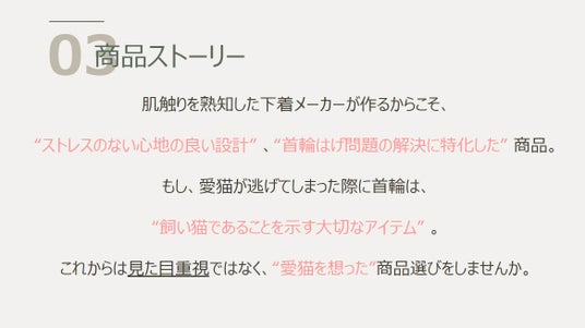 顧客ターゲット「主に今現在、首輪を付けていない飼い主の方」猫が嫌がりストレスを感じるので首輪を着けたくないが、万が一、脱走したり災害の際に迷子になった時の目印にしたいと思う方