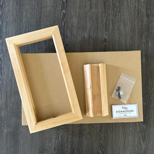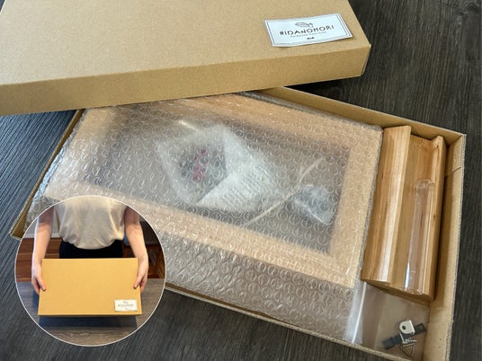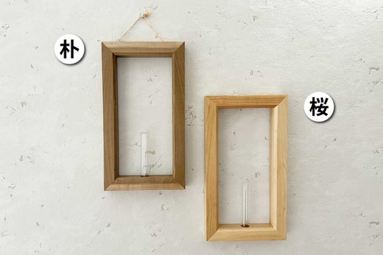 商品は、飛騨産の広葉樹「朴(ホオ)」「桜(サクラ)」の2樹種をラインナップしています。木材が持つ自然な風合いを生かすために、あえて着色はしていません。木目の雰囲気や色合いは、同じ樹種でも材木を取る位置や生育によって異なります。じっと見ると、フレーム一辺ごとでも木目の違いを楽しんでいただけます。
