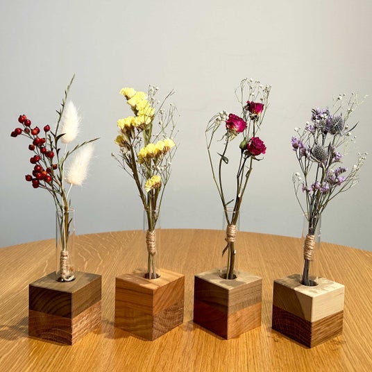 オプションでMOKURIN専用のドライフラワーミニブーケをご用意しています。ドライフラワーは、名古屋のドライフラワーショップ「ドライフラワーと暮らしのお店 その灯ぐらし」さんにご製作いただいたきました。『MOKURIN』に飾った際に美しく見えるよう、2~3種類の花を使った高さ20cm程の小さなブーケです。ブーケは定番のレッド、イエロー、パープルに加え、約3カ月毎に花材が変わる季節の花の4種類から選べます。