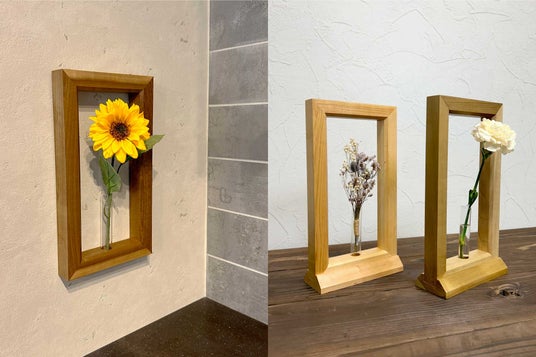 置いて飾る場合は、付属のスタンド脚を装着すると、置き型の一輪挿しとして場所を問わず使うことができます。スタンド脚も本体と同じ木材で製作しており、フレームを邪魔しない一体感のあるデザインです。