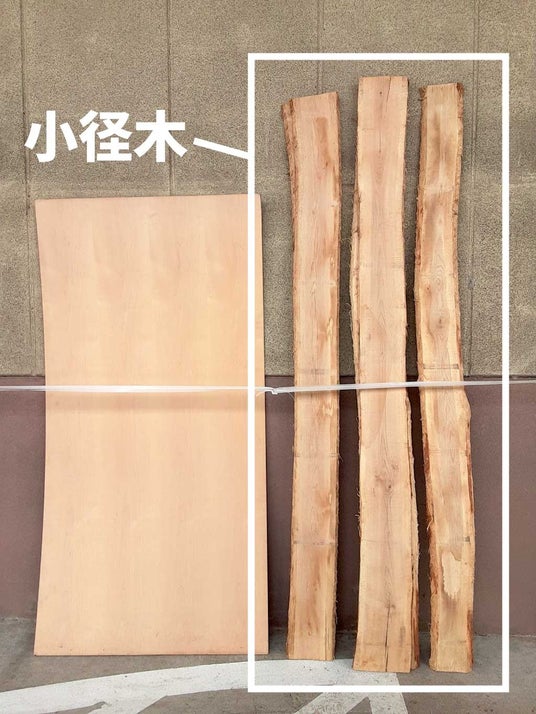 飛騨市内で伐採される樹木の特徴は、全体の68%が「広葉樹」で構成されており、直径が26cm以下の細い「小径木」の割合が多いことです。広葉樹は、針葉樹と比べて樹種が多く形や色、大きさがバラバラのため、個性豊かな反面、同規格や安定した量の確保が難しい木材です。同市は、今まで木材チップの材料として安価で販売していた広葉樹の小径木の価値を見直し、家具用材など新たな活用方法を模索しています。