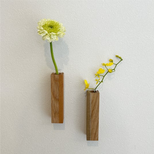 本体の裏側にマグネットが付いた一輪挿し。飛騨産広葉樹の「朴(ホオ)」「桜(サクラ)」「楢(ナラ)」の3つの樹種のうち、2種類をつなぎ合わせた「朴×楢」、「桜×楢」の2パターンをラインナップしています。