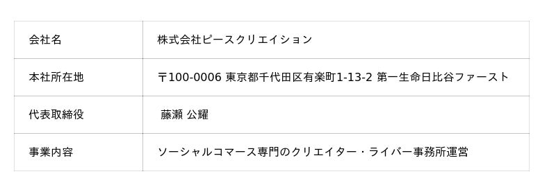ピースクリエイションは、親会社の株式会社いつも(本社:東京都千代田区、代表取締役社長:坂本守)が14,000件以上のEC・D2Cの総合支援で培ったノウハウと、グループ会社の株式会社ピースユー(本社:東京都千代田区、代表取締役:藤瀬公耀)が提供する日本最大級のライブコマースアプリ「Peace you LIVE」の運営実績や、ライバーとのネットワークを活かした、ソーシャルコマース専門のクリエイター・ライバー事務所です。