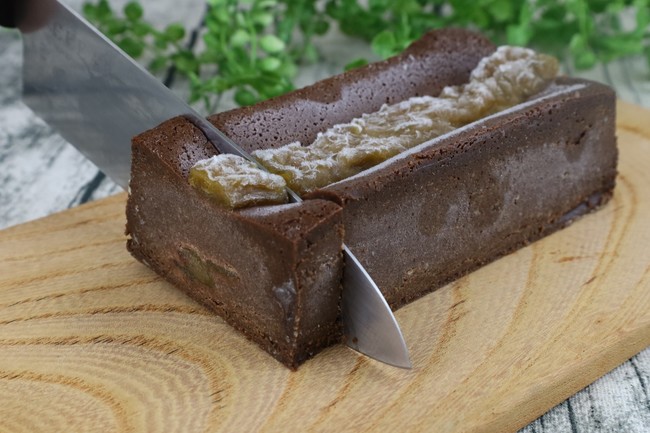 また、凍ったテリーヌショコラは切りやすくなっておりますので予め1食ずつカットし、ラップをした後に袋やタッパーに入れて冷凍保存しておけば、食べたい時に直ぐにヒンヤリとしたテリーヌショコラをお召し上がりいただくことができます。冷凍庫から出してすぐにお湯で温めて水気を拭いた包丁で上からゆっくり押しながらカットすることが綺麗に切れるコツとなっております。