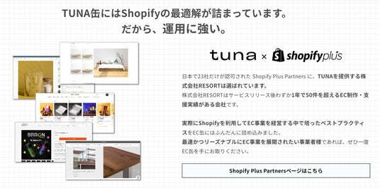 ソリューションサービス【 tuna 】ECパッケージで本格支援するチームRESORTが手がける、運用に強いShopifyのEC構築パッケージの名称です。「tuna-THE EC缶」は自らEC事業を運営している会社が導き出した、ECのノウハウ、経験値を凝縮。多くの企業がハマる落とし穴を事前に塞ぎ、事業成長及び拡大への最短距離を提示します。