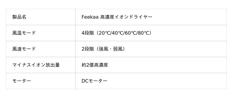 Feekaa スピーディーイオンドライヤーは、2億もの高濃度マイナスイオンを放出し、インテリジェントなNTCサーモスタットを搭載した大風量ヘアドライヤーです。