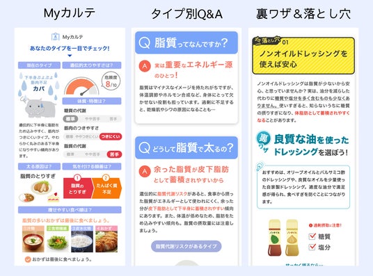 3. 裏ワザ&落とし穴:「よくある勘違い」をテーマに、さまざまな健康習慣について解説します「ノンオイルドレッシングを使えば安心」「糖質制限さえすれば痩せる」--こうした思い込みが、実は体質によっては逆効果になることも...。本コンテンツでは各タイプで陥りがちな落とし穴と、体質に合った賢い付き合い方を具体的に紹介します。