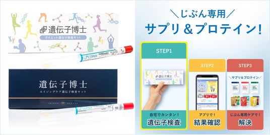 「遺伝子博士」は、自宅でできる簡単な遺伝子検査サービスです。検査結果に基づき、その人の体質に合った食事・運動アドバイスを提供。肥満遺伝子を調べる「遺伝子博士ダイエット」、老化遺伝子を調べる「遺伝子博士エイジングケア」を取り揃え、多くのお客様にご愛用いただいております。