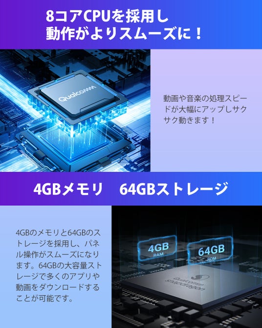 CPU:Qualcomm Snapdragon 665 8 コア、64 bit 11 nm、最大2.0 GHz