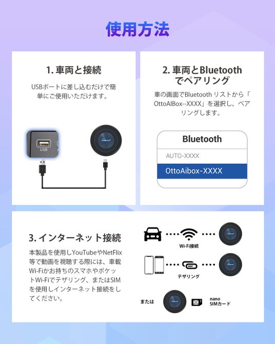 接続方法本製品を車両のUSBポートに挿します。車の画面でBluetoothリストから「OttoAIBox--XXXX」を選択し、ペアリングします。ポップアップで確認画面が表示されたら、「同意して確認完了」をクリックします。本製品とペアリング後、ottocast i3を使用しYouTubeやNetFlix等で動画を視聴する際には、車載Wi-Fiかお持ちのスマホやポケットWi-Fiでテザリング、またはSIMを使用しインターネット接続をしていただく必要があります。