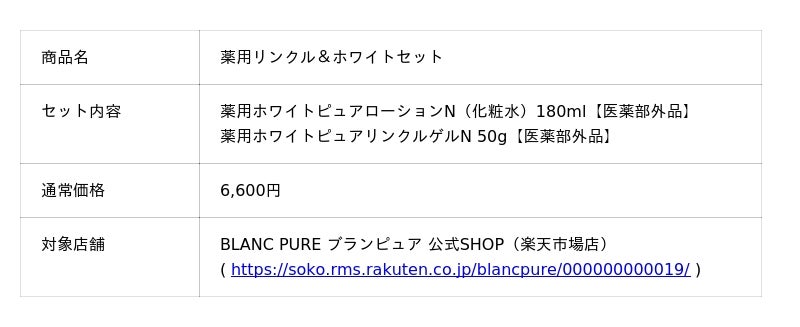 ピュアクリエイト株式会社(本社:埼玉県熊谷市)が運営するスキンケアブランド「BLANC PURE(ブランピュア)」は、2025年11月21日にお客様との出会いから3周年を迎えます。これを記念し、お客様からご要望をいただいておりました「薬用ホワイトピュアローションN(化粧水)」と「薬用ホワイトピュアリンクルゲルN」を組み合わせた『薬用リンクル&ホワイトセット(医薬部外品)』を、本日よりブランピュア楽天市場店にて発売いたします。