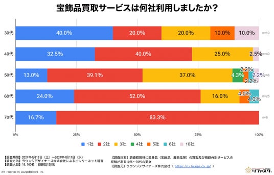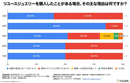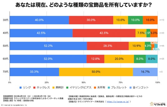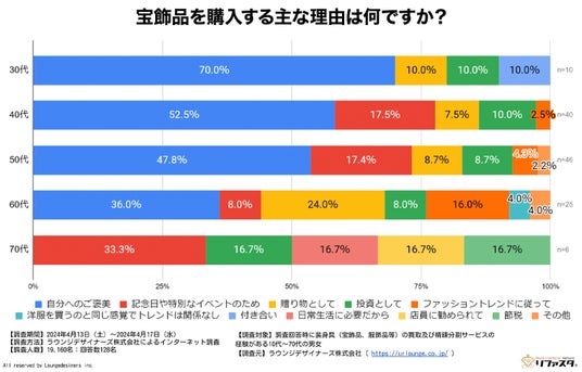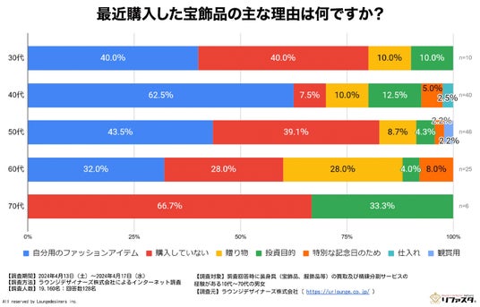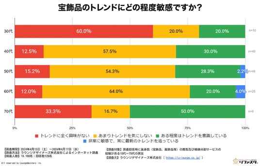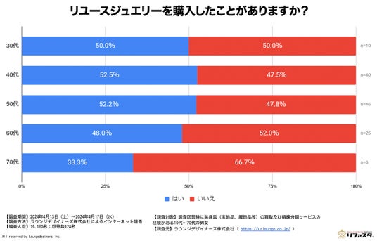 買取サービス『リファスタ』を展開するラウンジデザイナーズ株式会社(本社:東京都豊島区、代表取締役:杉 兼太朗)は、当サービスをご利用いただいた20代~70代の男女128名を対象に行ったサーベイ「宝飾品市場における消費者行動と意識調査」の調査結果を公開しました。