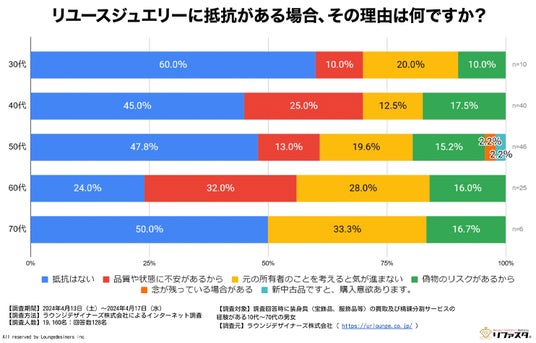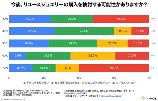 特に40代と50代でリユースジュエリーの購入を検討する可能性が比較的高く、70代ではまだまだ抵抗が見受けられる結果に。