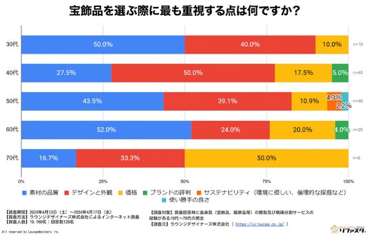 素材の品質、デザインと外観、そして価格が宝飾品選びの主な決定要因であることが分かります。年代別で見ると、30代は素材の品質とデザインを重視し、価格はそれほど重視していません。40代ではデザインの重要性が50%と最も高く素材の品質と価格のバランスを、50代と60代は素材の品質を非常に重視、特に60代ではその割合が52%に達しています。70代では、価格の重要性が増している結果となりました。