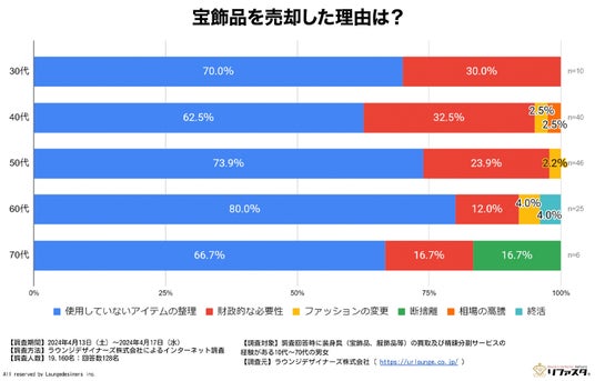 宝飾品の売却理由は主に「使用していないアイテムの整理」全年代において最も多くの割合を占めています。特に60代ではその傾向が顕著で、80%の人がこの理由で売却しています。また、財政的な必要性も各年代で一定の割合を占めており、特に40代と50代でその需要が高いことが分かります。