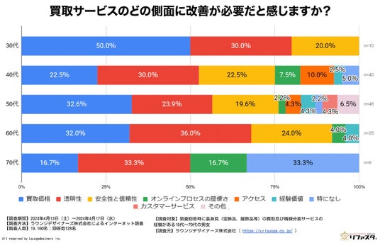 透明性と買取価格に関する改善要望が全年代に渡って高い結果に。特に透明性の改善は60代で最も強く求められています。また、安全性と信頼性も重要な改善ポイントとして多くの年代から指摘されています。
