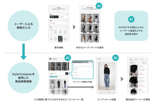 さらに、Style Compassは前述のユーザーの趣味嗜好を分析するためのアプリケーションとしても機能し、ユーザーのプロフィール情報や閲覧したコーディネート画像などから分析を実施します。この活動で得られたデータはmix.tokyoのコンテンツ制作をはじめとした、パーソナライズドされたEC体験のために活用される予定です。