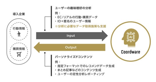 Coordwareは、AIの学習によって「使えば使うほど最適化される」仕組みを、導入企業ごとに提供する設計となっています。従来、個社ごとにAIをカスタマイズすることはコスト面で大きなハードルがありました。これを、生成AIを活用した独自設計によって低コストで実現し、導入後に提供するアウトプット(画像や記事コンテンツ)は、企業の要望やユーザー属性を反映できます。LTV向上が求められるマーケティング現場において、自社の顧客をロイヤルカスタマー化する手段として活用可能です。