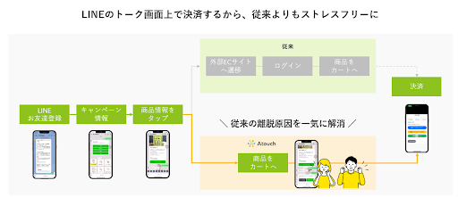 ■「Atouch」サービス概要「Atouch」サービスはLINEのトーク画面で商品を選んでそのまま決済まで完了!そんな便利機能を備えたシステムです。