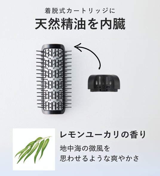 さらに、アタッチメントブラシには天然精油を内蔵したカートリッジ(着脱式)を取り付けることができ、天然精油【レモンユーカリ】の香りでリフレッシュしながらスタイリングすることが可能です。