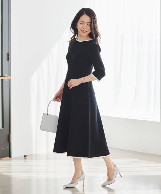 ツイードライク 襟付き ダブルボタン ワンピースツイード調素材と共布ベルトで、品よくメリハリが生まれるクラシカルワンピース。首元の開きやウエスト位置など、「着たときに気品が宿るバランス」を追求しました。