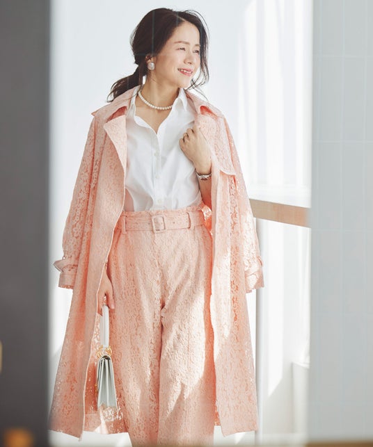 ■初回ラインナップ例総レース ロング トレンチコート本格トレンチを、贅沢な総レースで仕立てた一着。裏地とボタンを省いたミニマル設計で、軽やかに品よく羽織れるロングコートです。