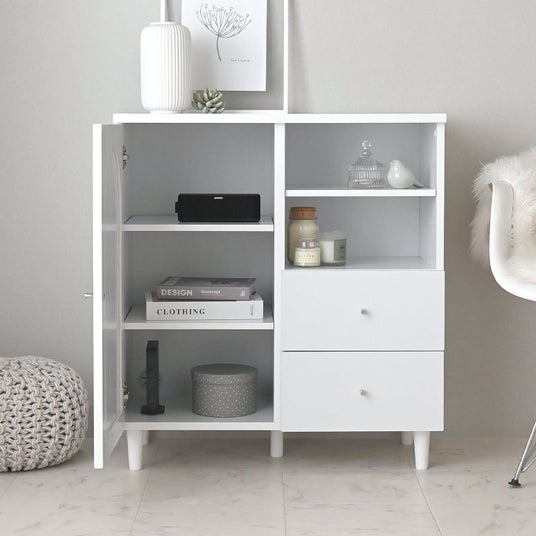今回お届けするのはマントルピースのようなデザインが特徴のキャビネットです。曲線と直線の絶妙なバランスが心地よく、収納力もたっぷり。日用品など生活感のあるものも、おしゃれにすっきりと収められます。