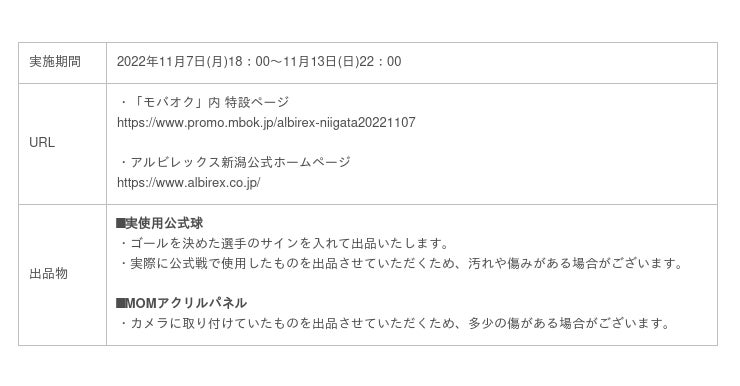 株式会社モバオク(本社:東京都渋谷区、代表取締役社長:生田目 知之、以下モバオク)が運営するオークションサービス「モバオク(https://www.mbok.jp/ )」は、株式会社アルビレックス新潟(以下、アルビレックス新潟)が実施する「アルビレックス新潟2022シーズンオークション」を2022年11月7日(月)から開始します。