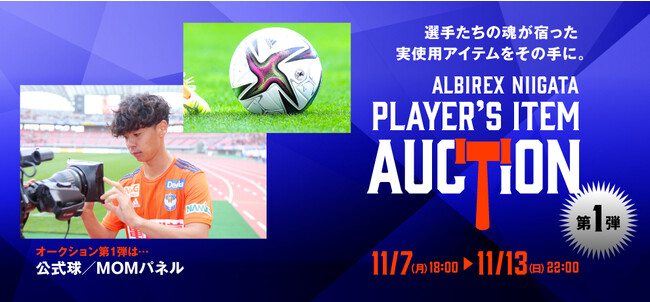 本オークションでは、アルビレックス新潟の所属選手が2022シーズンに実際に試合で使用し、ゴールを決めた選手がサインを入れた公式球や、試合で着用し本人がサインを入れたユニフォーム等が出品されます。本オークションは出品物によって、期間を3回に分けて開催します。