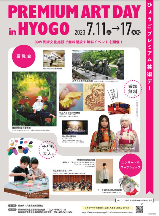 兵庫県 もっと身近に芸術文化を!「ひょうごプレミアム芸術デー」について「ひょうごプレミアム芸術デー」では、県立美術館や博物館をはじめ、市町立や民間の芸術文化施設で7月の1週間、無料開放・無料イベントを実施します。障害のある方や子育て中の方などにも配慮し、誰もが芸術文化を身近に感じ、親しめるための取組を進めていきます。