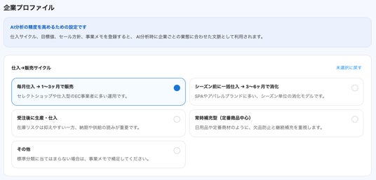 自社で設定した目標在庫日数や値下げ開始の目安をAIが参照し、一般論ではなく自社基準に沿った評価・提案が得られます。在庫管理会議や商品会議の事前準備を削減しながら、個別SKUに対する具体的なアクションまで素早く引き出すことが可能です。