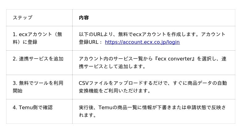株式会社ECXグループのグループ会社であるecx株式会社(本社:東京都渋谷区、代表取締役:小山貴之)は、自社が保有する商品登録データを、急成長中のグローバルECプラットフォーム「Temu」の出品形式に自動で変換・登録できる新ツール『ecx converter』の無料提供を開始します。