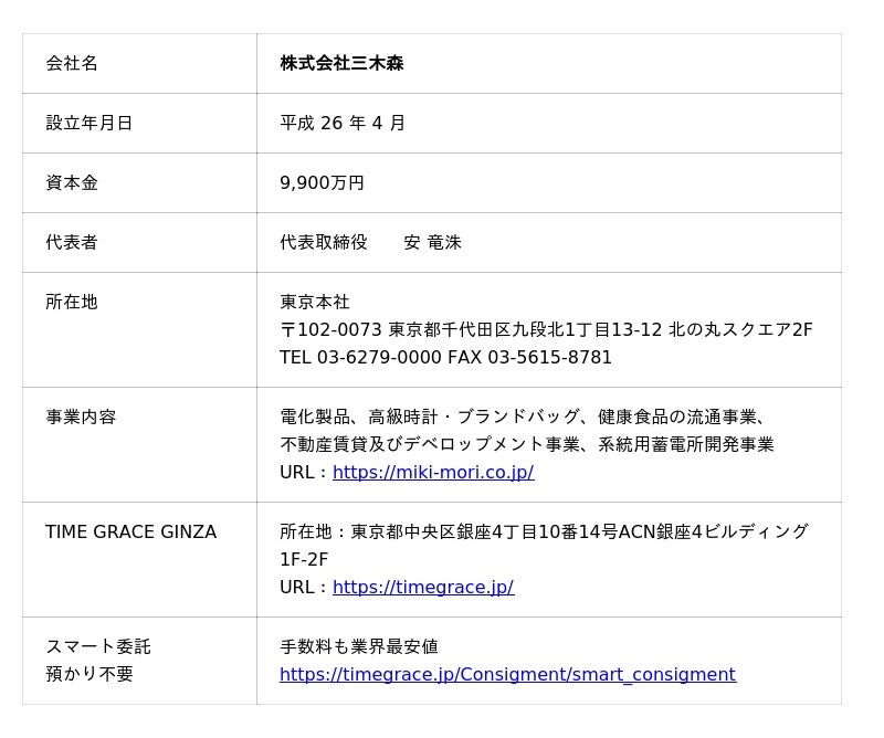 株式会社三木森 TIME GRACE GINZA 所在地:東京都中央区銀座4丁目10番14号 ACN銀座4ビルディング1F-2F