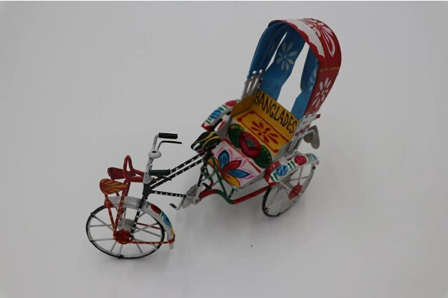 バングラデシュで“国民の足”といわれる色鮮やかなデザインが特徴の三輪自転車タクシー「リキシャ」のミニチュアと手漕ぎ船の置物