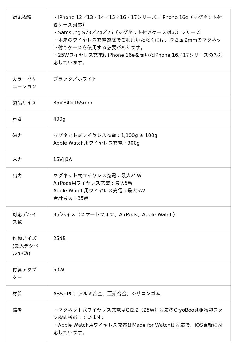 ESRが2022年に開発した独自の冷却ファンシステム「CryoBoost(R)」冷却ファン技術を搭載し、充電時に必ず発生する温度上昇を非冷却ファン製品に比べて、最大3.6℃低い温度で充電できます。これにより、高温による充電速度の当製品は、室温25℃の状況下の蓄熱比較試験によると、Apple公式の35Wケーブル充電と同等の速度で充電が行えます。横置き・縦置きの両方に対応し、夜間はファンを停止できる静音モードも備えています。AppleのOSバージョン更新にも対応しており、iOS 18以降のアップデートでも使い続行けることができます。また、付属の50W対応充電アダプターへ差し替えることで、MacBook Airの充電も可能です。