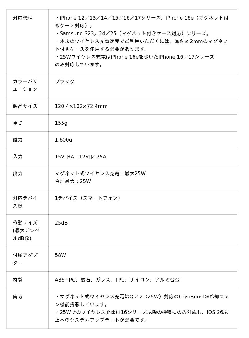 1.Qi2.2対応25W高速充電+CryoBoost(R)冷却技術低温を保ちながら安全性と充電効率を大幅に向上します。
