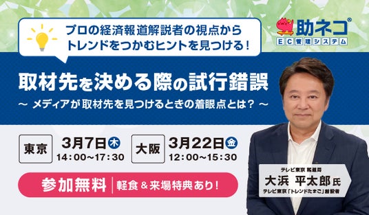ネットショップ向け業務管理システム「助ネコ(R)EC管理システム(以下、助ネコ)」を運営する株式会社アクアリーフ(本社:神奈川県平塚市、代表取締役 長谷川 智史)は、ネットショップの経営者やマーケティング担当者向けに、テレビ東京「トレンドたまご」創設者の大浜平太郎氏による特別講演会を開催いたします。
