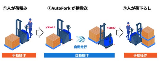 作業者が始点にてAutoForkをマニュアル操作し、パレットを持ち上げた状態で所定の位置から自動搬送を開始すると、AutoForkはルートを自動走行し、荷下ろし場所付近の目的地点まで搬送します。終点では、作業者がマニュアル操作へ切り替えてパレットを荷下ろしします。