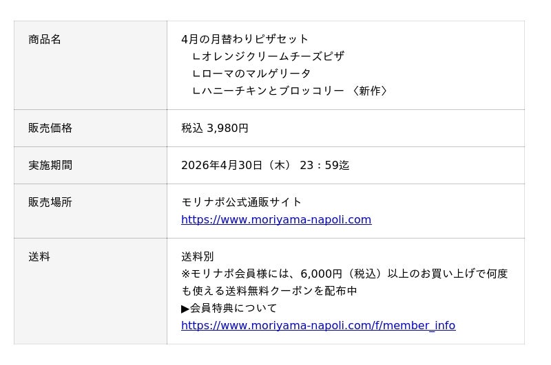 春の食卓を明るく彩るラインナップは、ご家族での団らんや、ちょっとした集まりにもぴったりです。ご自宅の調理器具で温めるだけで、いつでも手軽に本格的な味わいが楽しめるモリナポのピザを、ぜひお試しください。