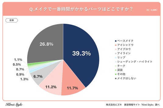 全国の20代~50代の女性を対象に、「メイクで一番時間がかかるパーツはどこですか?」というアンケートを実施したところ、最も多かった回答は「ベースメイク」で39.3%となりました。次いで、「アイシャドウ」が11.7%、「アイブロウ」が11.2%と続く結果となりました。