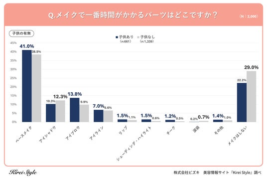 子供の有無で見ると、そこまで大きな差は見られなかったものの、「メイクはしない」を除き、最も差が出た項目は「アイブロウ」で「子供あり」が3.9%上回る結果となりました。