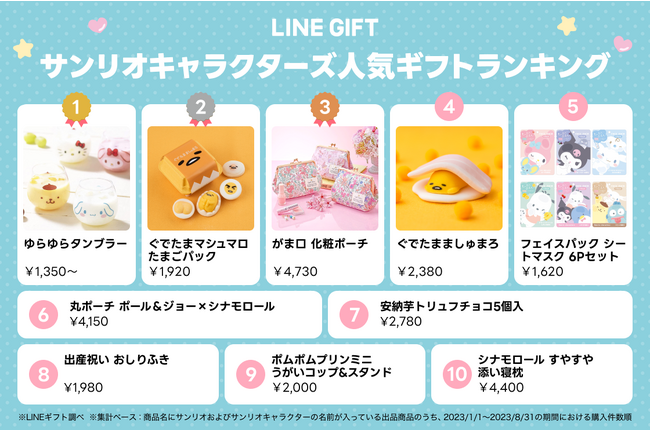 1位:ゆらゆらタンブラー2位:ぐでたまマシュマロ たまごパック3位:がま口 化粧ポーチ4位:ぐでたまましゅまろ5位:フェイスパック シートマスク 6Pセット6位:丸ポーチ ポール&ジョー×シナモロール7位:安納芋トリュフチョコ5個入8位:出産祝い おしりふき9位:ポムポムプリンミニうがいコップ&スタンド10位:シナモロール すやすや添い寝枕※LINEギフト調べ
