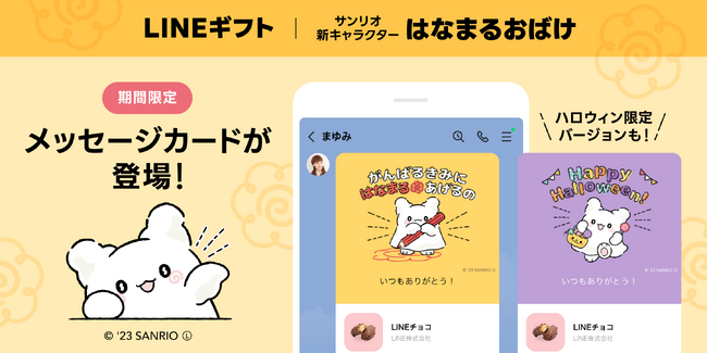 LINEヤフー株式会社は、「LINE」アプリを通じて友だちにさまざまなプレゼントを贈ることができるサービス「LINEギフト」において、ファン投票により今年電撃デビューしたサンリオの新キャラクター「はなまるおばけ」とのコラボキャンペーンを本日より開始します。これに合わせて「サンリオキャラクターズ人気ギフトランキングTOP10」を発表しました。また、ハロウィンをもっと楽しむギフトを集めた「ハロウィン特集」も本日より公開しました。