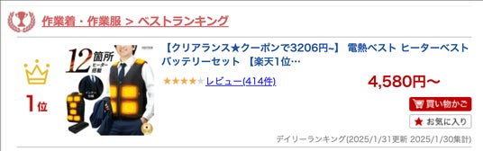 楽天市場デイリーランキング作業着・作業服ベストランキング1位(2025/1/31時点)