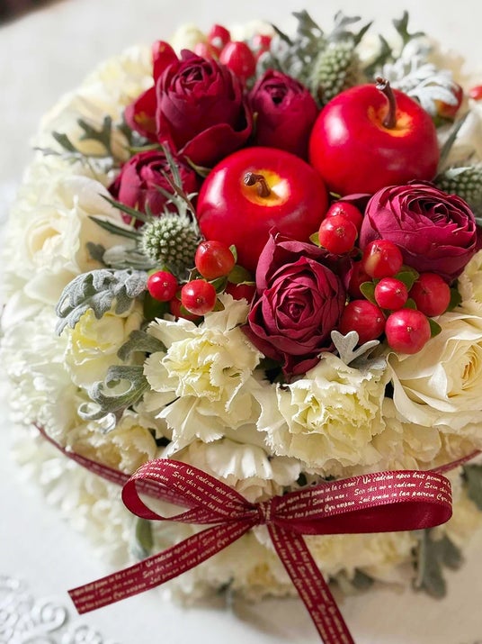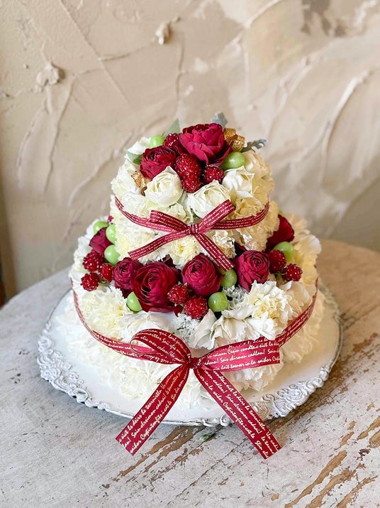 華やかで上品な生花のフラワーケーキ。ふわふわのカーネーションをクリームに見立てて可愛らしくおまとめしました。トッピング・リボンのお色味はお好きな色をご指定いただけます。お誕生日の贈りものや、生誕祭の撮影にぴったりの商品です。