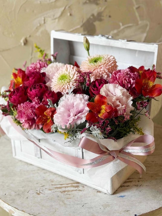 アンティーク調のトレジャーボックスに、花々を詰め込んだ華やかなアレンジメント。上品で遊び心のあるデザインに仕上げました。 トレジャーボックスはお花を楽しんでいただきました後は、小物入れ等にもお使いいただけます。